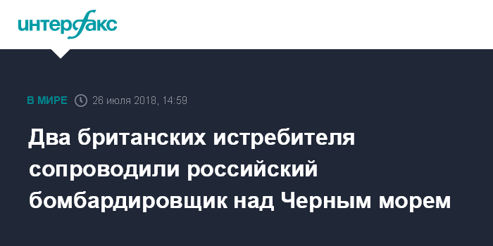 Москва. 26 июля. INTERFAX.RU - Королевские военно-воздушные силы Великобритании в четверг сообщили о том, что два британских истребителя "Тайфун", дислоцированные в Румынии, сопроводили над Черным морем российский бомбардировщик, приблизившийся к границам НАТО.