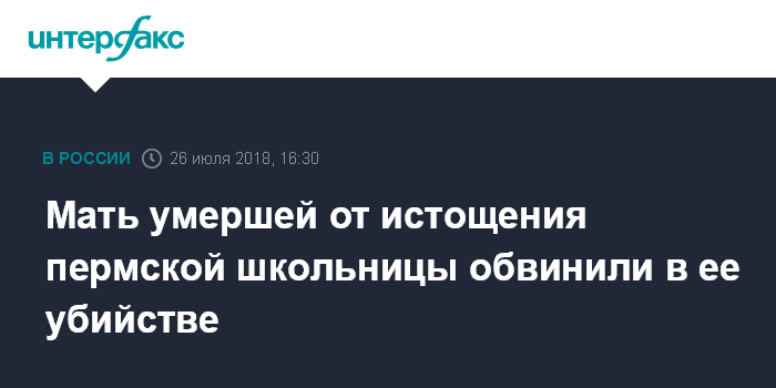 Москва. 26 июля. INTERFAX.RU - Следственные органы предъявили обвинение жительнице города Краснокамска Пермского края, чья 14-летняя дочь умерла, по некоторым данным, от истощения.