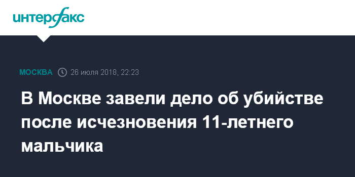 Москва. 26 июля. INTERFAX.RU - Следователи возбудили уголовное дело об убийстве по факту пропажи 11-летнего ребенка в Москве, сообщила "Интерфаксу" в четверг представитель столичного главка Следственного комитета Юлия Иванова.