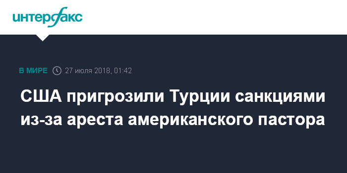 Москва. 27 июля. INTERFAX.RU - США пригрозили Турции санкциями из-за ареста американского пастора Эндрю Брансона, подозреваемого турецкими властями в шпионаже и террористической деятельности, сообщает в четверг информагентство Associated Press.