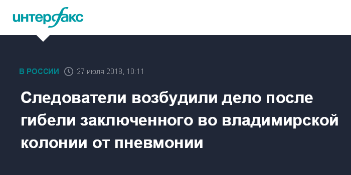 Москва. 27 июля. INTERFAX.RU - Владимирские следователи возбудили уголовное дело по факту смерти заключенного в исправительной колонии №6, сообщил "Интерфаксу" в пятницу представитель регионального СУ СКР.