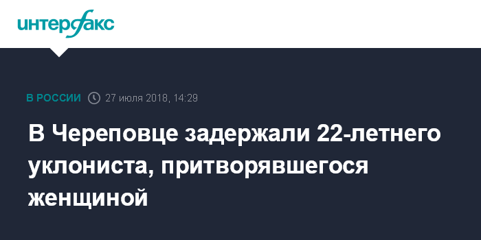 Москва. 27 июля. INTERFAX.RU - В Череповце задержали объявленного в розыск 22-летнего уклониста от службы в армии, который переоделся в женскую одежду, сообщили "Интерфаксу" в пресс-службе управления Росгвардии в Вологодской области.