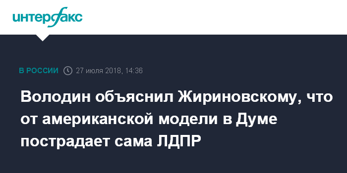 "У них (США) порядка 100 партий, но у власти две партии. У них 100% мажоритарная система, они все избираются по одномандатным округам. Если реализовать (американскую) модель у нас, то скорее всего, второй партией будет КПРФ, а больше всех пострадает от реализации этой американской модели фракция ЛДПР",- сказал Володин в ходе пресс-конференции по итогам весенней сессии.