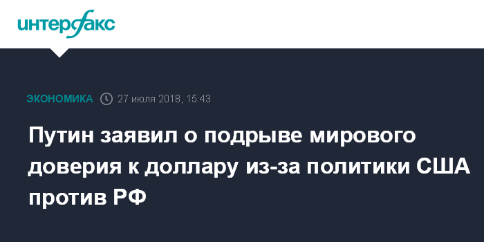Москва. 27 июля. INTERFAX.RU - Президент РФ Владимир Путин назвал попытки США использовать доллар в качестве средства давления на Россию большой стратегической ошибкой, подчеркнув, что тем самым в мире подрывается доверие к американской валюте.