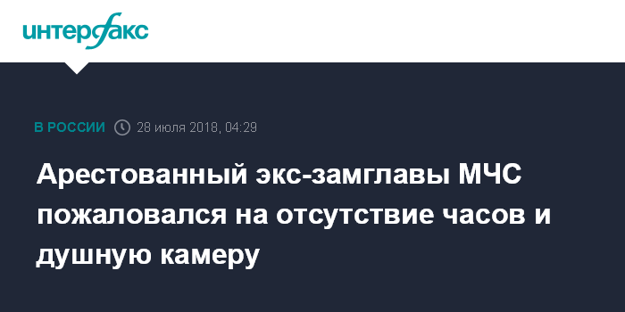 Арестованный экс-замглавы МЧС пожаловался на отсутствие часов и душную камеру