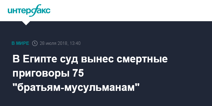Москва. 28 июля. INTERFAX.RU - Суд Египта приговорил к высшей мере наказания 75 членов движения "Братья-мусульмане" (запрещено в РФ), включая ряд его руководителей, за их участие в демонстрациях протеста 2013 года, передает в субботу агентство Associated Press.