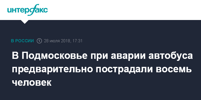 Москва. 28 июля. INTERFAX.RU - Не менее восьми человек пострадали в результате ДТП с автобусом в Домодедовском районе Подмосковья, сообщил "Интерфаксу" источник в экстренных службах в субботу.