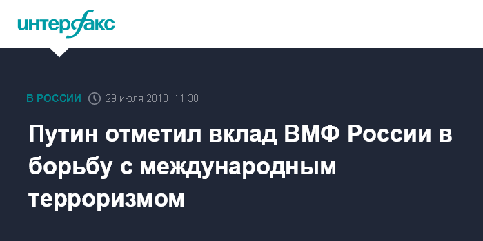 Москва. 29 июля. INTERFAX.RU - Российский военно-морской флот вносит существенный вклад в борьбу с международным терроризмом, заявил президент РФ Владимир Путин.
