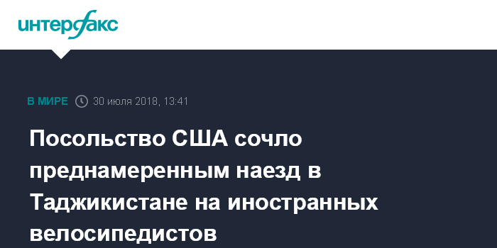 Москва. 30 июля. INTERFAX.RU - Посольство США предполагает, что наезд автомобиля на группу велосипедистов, приведший к гибели иностранных туристов, среди которых были и граждане США, является "преднамеренной атакой". Об этом сообщили в понедельник местные СМИ со ссылкой на сотрудника отдела информации посольства США в Таджикистане Джеффа Риденора.
