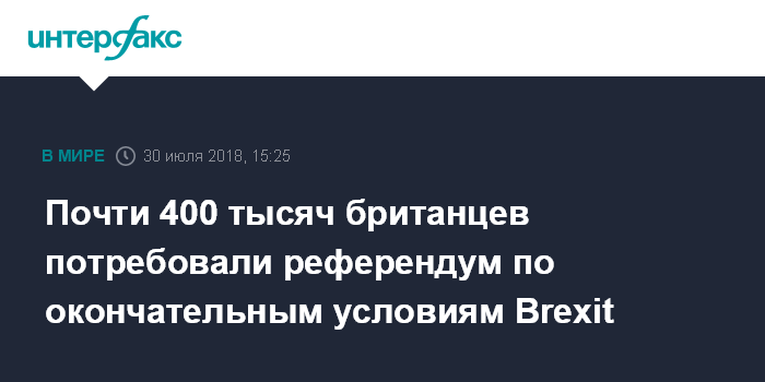 Москва. 30 июля. INTERFAX.RU - Около 378 тысяч человек подписали петицию с призывом организовать референдум по окончательным условиям выхода Великобритании из Евросоюза.