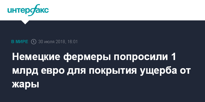 Москва. 30 июля. INTERFAX.RU - Необычайно жаркая погода в Германии, к тому же сохраняющаяся продолжительное время, наносит фермерским хозяйства страны существенный ущерб. Глава Немецкого союза крестьян (DBV) Йоахим Руквид призвал правительство ввести чрезвычайное положение и оказать фермерам финансовую помощь, передает Deutsche Welle.