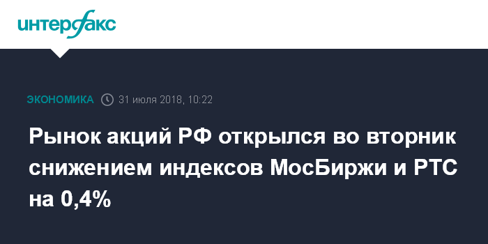 Москва. 31 июля. INTERFAX.RU - Рынок акций РФ открылся во вторник умеренным снижением цен большинства "голубых фишек" на фоне негативной динамики мировых рынков капитала; индексы МосБиржи и РТС за минуту торгов потеряли 0,4%.