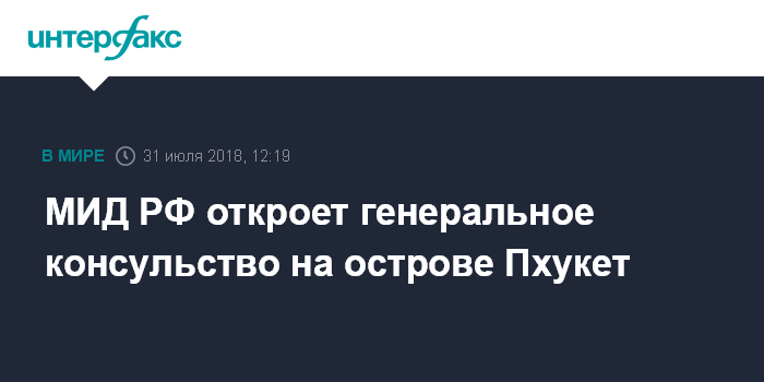 Москва. 31 июля. INTERFAX.RU - МИД РФ откроет на острове Пхукет в Таиланде генеральное консульство в 2018 году, следует из распоряжения председателя правительства РФ Дмитрия Медведева, размещенного на официальном портале правовой информации.