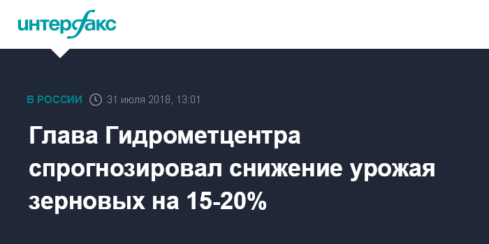 Москва. 31 июля. INTERFAX.RU - Урожай зерновых культур на территории России будет ниже прошлогодних значений, заявил исполняющий обязанности руководителя Гидрометцентра России Дмитрий Киктёв.