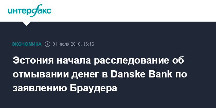 Москва. 31 июля. INTERFAX.RU - Эстонская прокуратура во вторник начала расследование на основании жалобы обвиняемого в РФ в мошенничестве главы компании Hermitage Capital Уильяма Браудера, который на минувшей неделе заявил о причастности 26 сотрудников эстонского отделения Danske Bank к отмыванию миллиардов долларов.