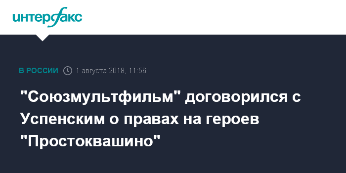 Москва. 1 августа. INTERFAX.RU - Писатель и сценарист Эдуард Успенский согласился на предложение киностудии "Союзмультфильм" и предоставил ей исключительные права на использование оригинальных сценариев "Простоквашино", а также лицензию на товарные знаки с именами любимых героев этих мультфильмов, сообщили "Интерфаксу" в пресс-службе киностудии.