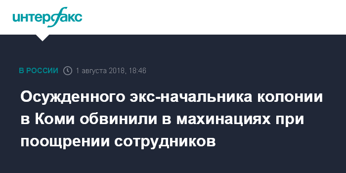 Москва. 1 августа. INTERFAX.RU - Бывшего начальника исправительной колонии №19 в Ухте (Коми) Юрия Амосова, приговоренного к 9,5 годам общего режима, обвинили в злоупотреблении должностными полномочиями и присвоении средств.