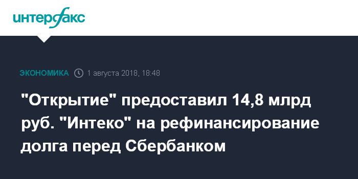 О рефинансировании "Открытием" части задолженности "Интеко" перед Сбербанком ранее в среду сообщил зампред ЦБ РФ Василий Поздышев. "Больший объем (задолженности - прим. ИФ) был в Сбербанке. Там "Открытие" сейчас забирает часть задолженности", - сказал зампред ЦБ журналистам. При этом он не назвал точную сумму, которую реструктурирует "Открытие".