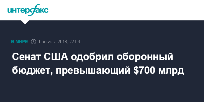 Москва. 1 августа. INTERFAX.RU - Сенат США в среду проголосовал за оборонный бюджет на 2019 финансовый год размером в $717 млрд, сообщает The Washington Examiner.