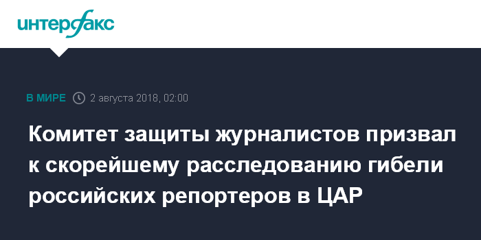 Москва. 2 августа. INTERFAX.RU - Международная неправительственная организация "Комитет защиты журналистов" (CPJ) призвала власти Центральноафриканской Республики и России, а также ООН незамедлительно и всесторонне расследовать гибель трех российских журналистов в ЦАР.
