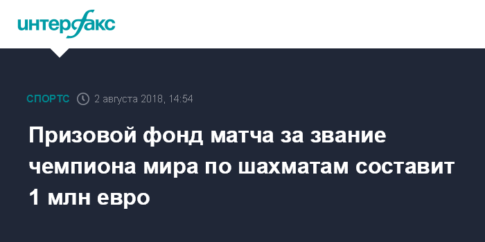 Москва. 2 августа. INTERFAX.RU - Организаторы матча за звание чемпиона мира по шахматам между норвежцем Магнусом Карлсеном и американцем Фабиано Каруаной подтвердили, что его призовой фонд составит 1 млн евро.