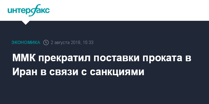 Москва. 2 августа. INTERFAX.RU - "Магнитогорский металлургический комбинат" (ММК) полностью прекратил поставки проката в Иран в связи с антииранскими санкциями, сообщил в ходе телефонной конференции директор по экономике ММК Андрей Еремин.