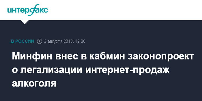 Москва. 2 августа. INTERFAX.RU - Минфин РФ внес в правительство законопроект о регулировании розничной продажи алкогольной продукции в интернете, сообщает пресс-служба министерства со ссылкой на директора департамента налоговой и таможенной политики Алексея Сазанова.