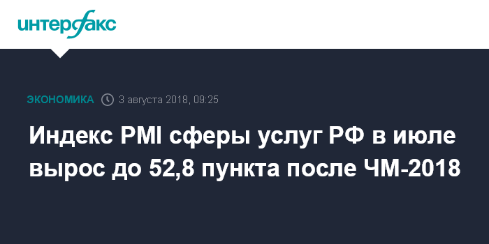 Москва. 3 августа. INTERFAX.RU - Индекс PMI сферы услуг России в июле 2018 года составил 52,8 пункта против 52,3 пункта в июне на фоне роста новых заказов и повышения деловой активности после завершения ЧМ-2018, свидетельствуют данные исследования IHS Markit.