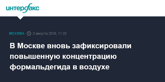 Москва. 3 августа. INTERFAX.RU - Третий день подряд на фоне аномальной жары в Москве фиксируются повышенные концентрации формальдегида в атмосферном воздухе, сообщает Росгидромет.