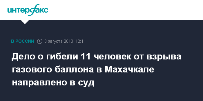 Ранее сообщалось, что 1 августа 2016 года в банкетном зале "Лайли" в Махачкале взорвался газовый баллон 1975 года выпуска. От полученных травм и ожогов 11 человек погибли и еще 17 пострадали.