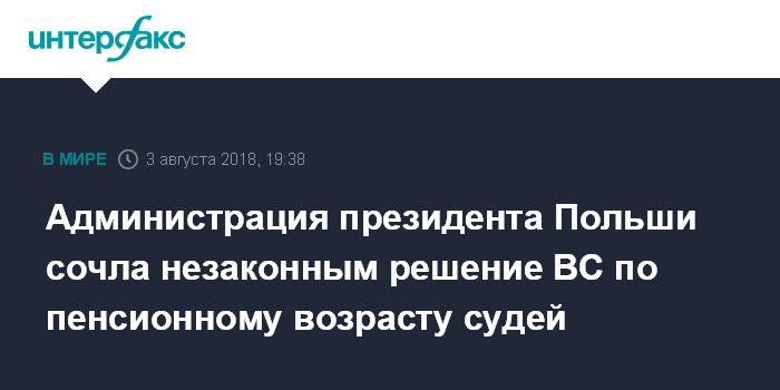 Москва. 3 августа. INTERFAX.RU - Администрация президента Польши Анджея Дуды в пятницу опубликовала заявление, в котором осудила решение Верховного суда приостановить вступление в силу нового закона о сроках выхода судей на пенсию, сообщает агентство Associated Press.
