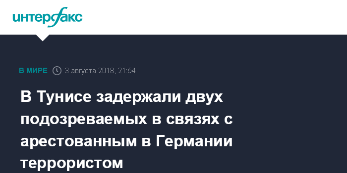 Москва. 3 августа. INTERFAX.RU - Полиция Туниса задержала двух мужчин, предположительно имевших отношение к разоблаченному плану террористической атаки в Германии, сообщили в пятницу в МВД Туниса.