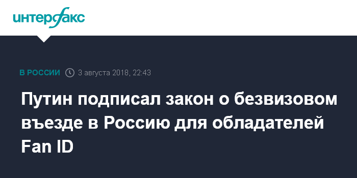 Москва. 3 августа. INTERFAX.RU - Президент России Владимир Путин подписал закон, разрешающий обладателям паспортов болельщика (Fan ID) безвизовый въезд в страну до конца 2018 года, документ опубликован на официальном портале правовой информации.