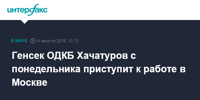Москва. 4 августа. INTERFAX.RU - Генеральный секретарь ОДКБ Юрий Хачатуров, обвиняемый в Армении в свержении конституционного строя в 2008 году, с понедельника приступит к исполнению своих обязанностей в Москве, заявил адвокат Хачатурова Мигран Погосян.