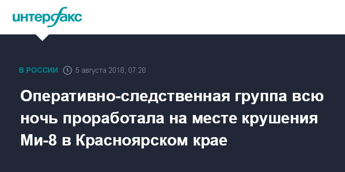 Москва. 5 августа. INTERFAX.RU - Специалисты межведомственной оперативно-следственной группы по расследованию причин крушения вертолета Ми-8 недалеко от города Игарка Красноярского края работали на месте происшествия всю ночь, сообщили агентству "Интерфакс" в единой дежурно-диспетчерской службе (ЕДДС) Туруханского района края.