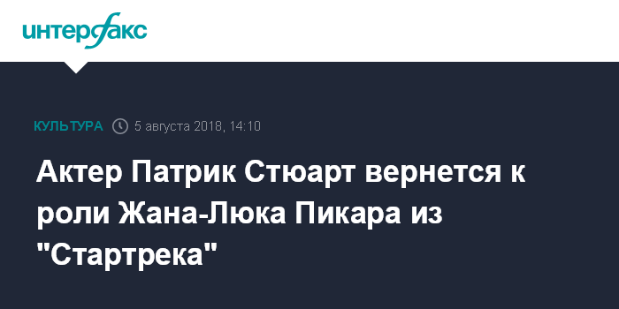 Москва. 5 августа. INTERFAX.RU - Британский актер Патрик Стюарт вновь сыграет роль капитана Жана-Люка Пикара в продолжении ставшего культовым американского сериала "Звездный путь" ("Стартрек").