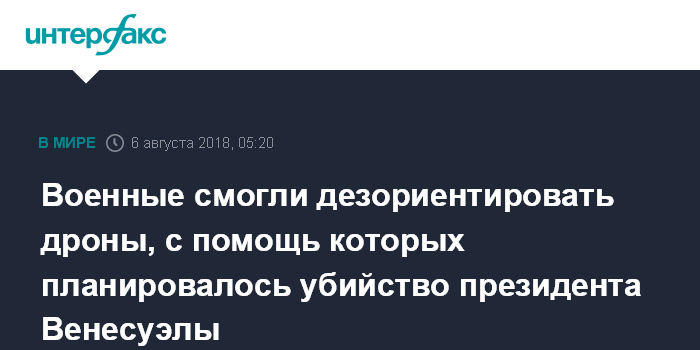 Москва. 6 августа. INTERFAX.RU - Венесуэльским военным удалось обнаружить и дезориентировать полет дронов, которые были предназначены для убийства президента страны Николаса Мадуро и его окружения, сообщил министр внутренних дел республики Нестор Ревероль.