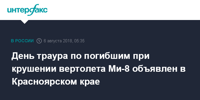 Москва. 6 августа. INTERFAX.RU - Понедельник объявлен в Красноярском крае днем траура в память о жертвах крушения вертолета Ми-8 под Игаркой, сообщило краевое правительство.