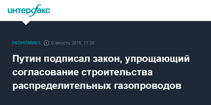 Москва. 6 августа. INTERFAX.RU - Президент РФ Владимир Путин 3 августа подписал закон о внесении изменений в Градостроительный кодекс, призванные упростить строительство и реконструкцию сетей газораспределения и газопотребления и снизить административные барьеры в этой сфере, текст указа президента публикует Официальный сайт правовой информации.