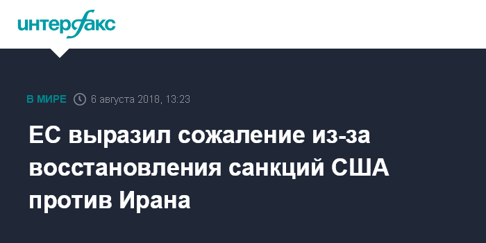 Москва. 6 августа. INTERFAX.RU - ЕС выражает сожаление в связи с восстановлением санкций США в отношении Ирана, говорится в совместном заявлении главы дипломатии ЕС Федерики Могерини и глав МИД Франции, Германии и Великобритании.