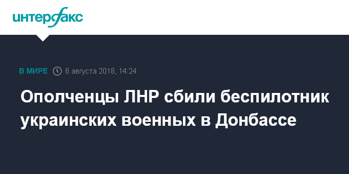 Москва. 6 августа. INTERFAX.RU - Военнослужащие Народной милиции самопровозглашенной Луганской народной республики сбили беспилотный летательный аппарат Вооруженных сил Украины, проводивший воздушную разведку над территорией ЛНР, заявил представитель военного ведомства республики Андрей Марочко.