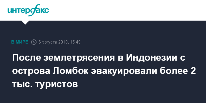 Москва. 6 августа. INTERFAX.RU - Власти Индонезии в понедельник после мощного землетрясения эвакуировали более 2 тысяч туристов с индонезийского острова Ломбок, сообщают местные СМИ.
