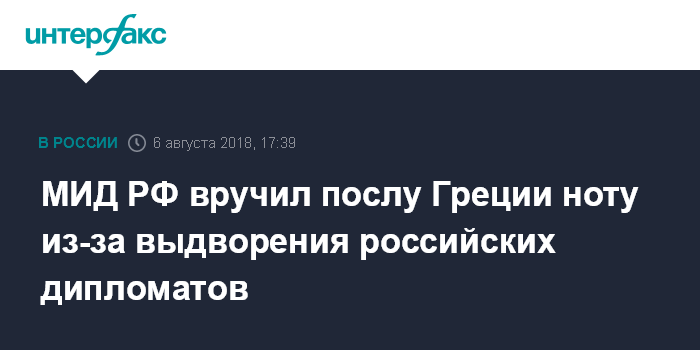 "6 августа в МИД России был вызван Чрезвычайный и Полномочный Посол Греческой Республики в Российской Федерации Андреас Фриганас, где ему была вручена нота, информирующая о принятых российской стороной зеркальных мерах в ответ на недружественные действия Афин в июле с.г. в отношении российских дипломатических сотрудников и граждан", - говорится в сообщении на сайте МИД РФ.