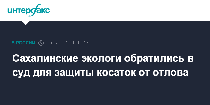 Москва. 7 августа. INTERFAX.RU - Южно-Сахалинский городской суд принял иск экологов в защиту косаток, сообщается во вторник на сайте общественной организации "Экологическая вахта Сахалина".