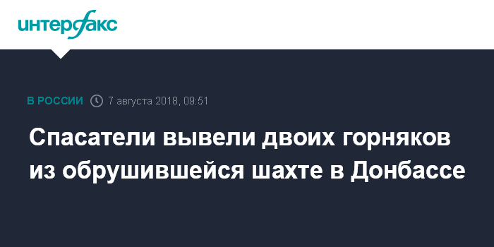 Москва. 7 августа. INTERFAX.RU - Два горняка из обрушившейся шахты в Донбассе найдены живыми, судьба ещё двоих остается неизвестной, говорится в сообщении МЧС самопровозглашенной Донецкой народной республики.