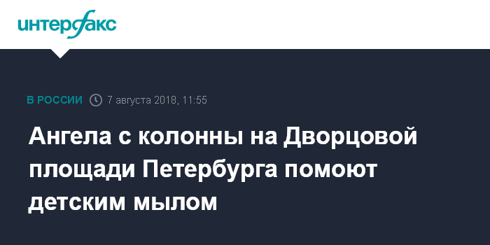 Москва. 7 августа. INTERFAX.RU - Ангела, венчающего Александровскую колонну на Дворцовой площади Петербурга, помоют впервые с 2001 года, для этого будет использоваться детское мыло.