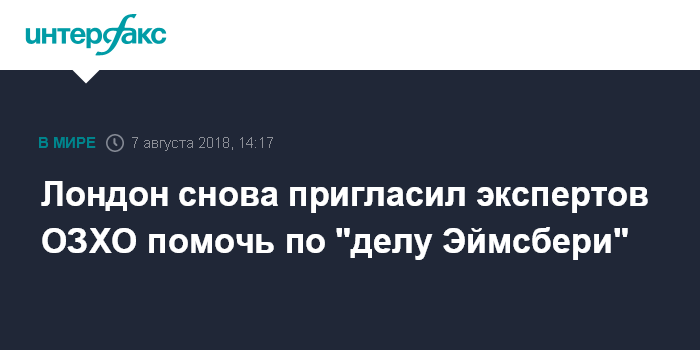 Москва. 7 августа. INTERFAX.RU - Правительство Великобритании предложило независимым экспертам ОЗХО вернуться в страну и продолжить сотрудничество с британской полицией в расследовании инцидента в Эймсбери, говорится в распространенном во вторник заявлении британского МИД.