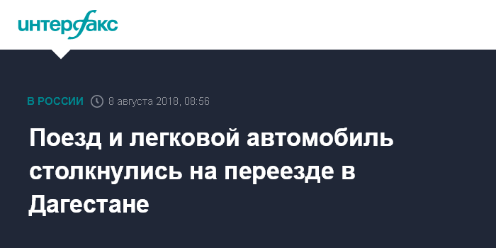 Москва. 8 августа. INTERFAX.RU - Поезд и легковой автомобиль столкнулись на железнодорожном переезде в Карабудахкентском районе Дагестана накануне поздно вечером, есть жертвы. Об этом сообщили агентству "Интерфакс" в пресс-службе ГУ МВД России по республике.