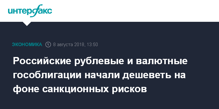 Москва. 8 августа. INTERFAX.RU - Российские рублевые и валютные гособлигации заметно падают в цене 8 августа на фоне ряда публикаций в СМИ относительно новых антироссийских санкций со стороны США; как следствие, растут доходности евробондов РФ и облигаций федерального займа (ОФЗ).