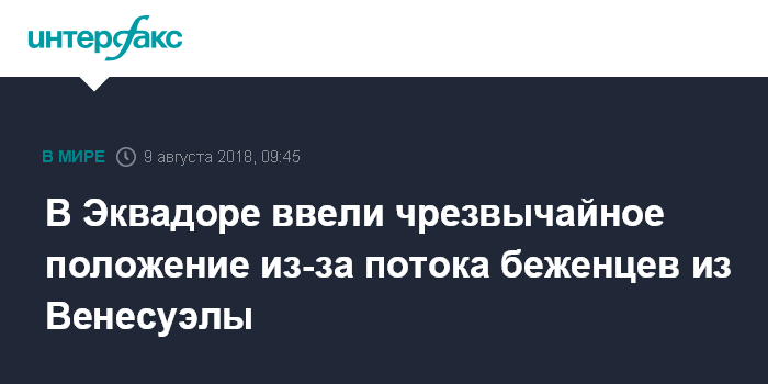 Москва. 9 августа. INTERFAX.RU - Власти Эквадора ввели в стране режим чрезвычайного положения в связи с наплывом венесуэльских беженцев, которые через Колумбию пытаются добраться до Эквадора, говорится в заявлении МИД страны.